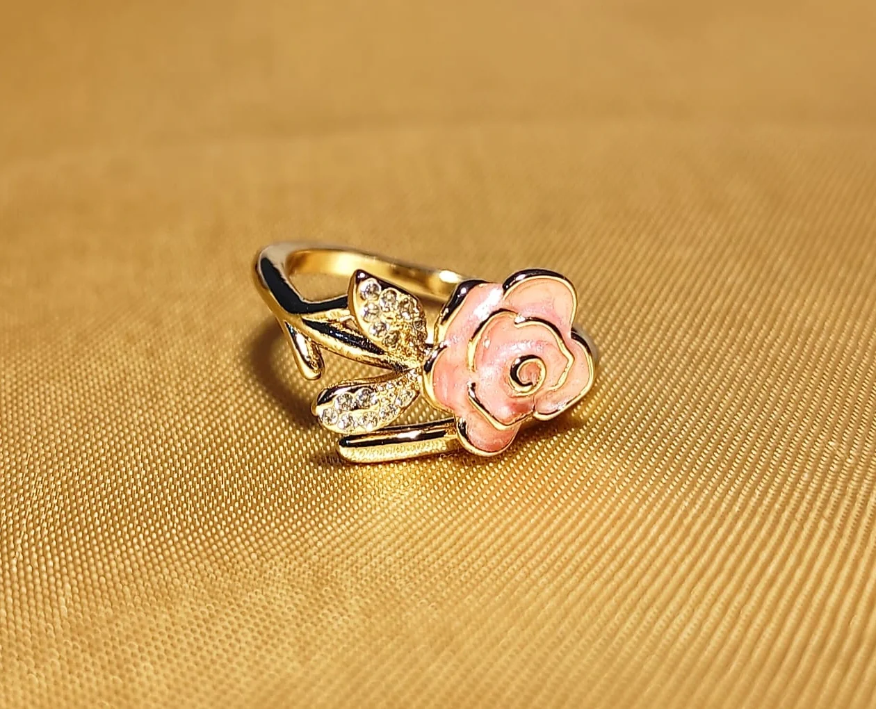 Add a touch of floral elegance to your jewelry collection with this beautiful rose-inspired ring, designed to capture charm and femininity. Featuring a delicately crafted pink rose motif accented with sparkling stone-studded leaves, this ring is finished in a rich 18-karat gold-plated coating that gives it a luxurious glow. The graceful design makes it perfect for both everyday wear and special occasions.
