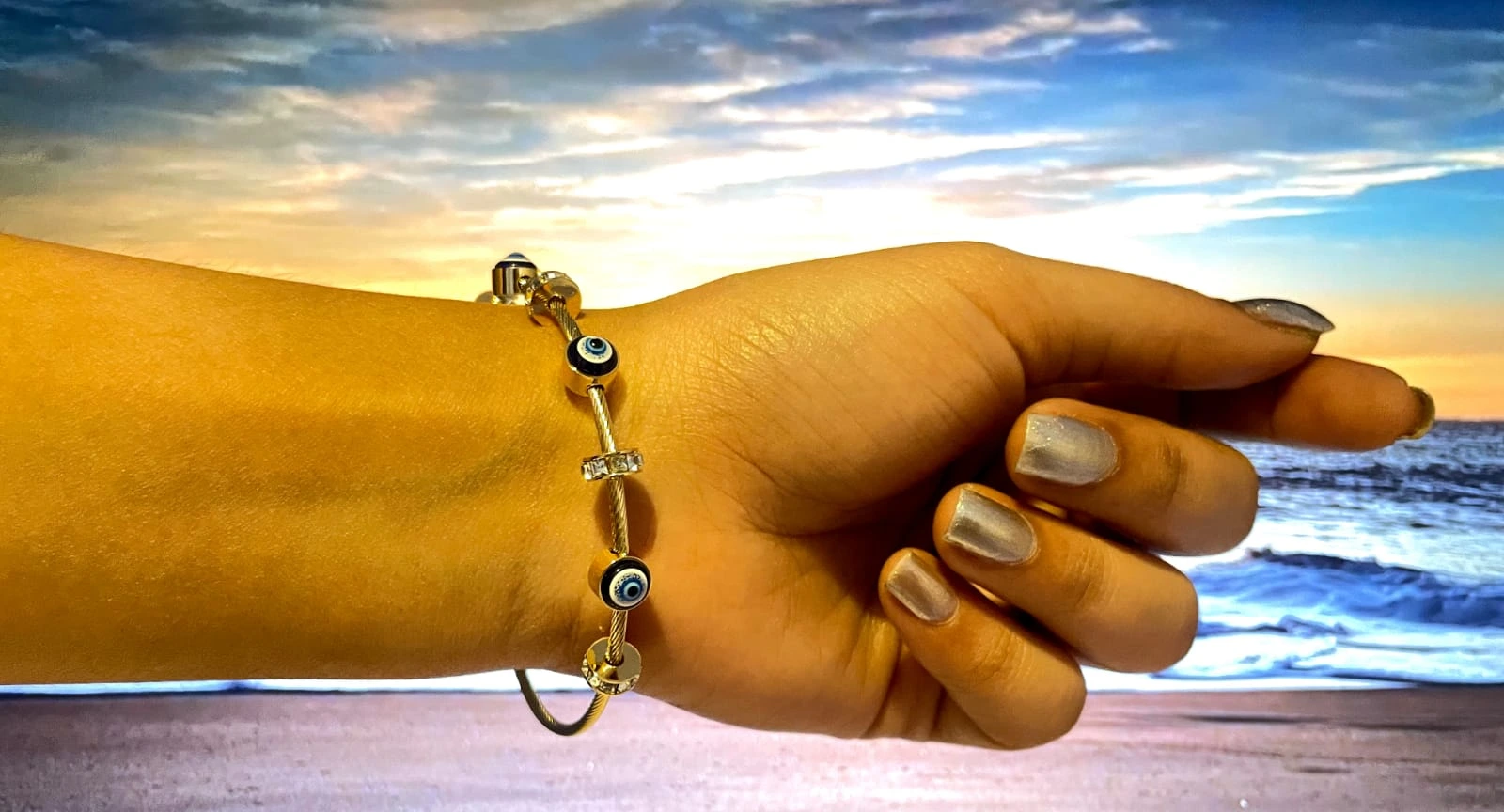 This stylish evil eye bracelet is designed to bring protection, positivity, and elegance together. Featuring a beautifully crafted evil eye charm, it adds a trendy yet meaningful touch to your look. Made with 18K gold plating and anti-tarnish coating, this bracelet ensures long-lasting shine and durability. Lightweight and comfortable, it’s perfect for everyday wear and gifting.