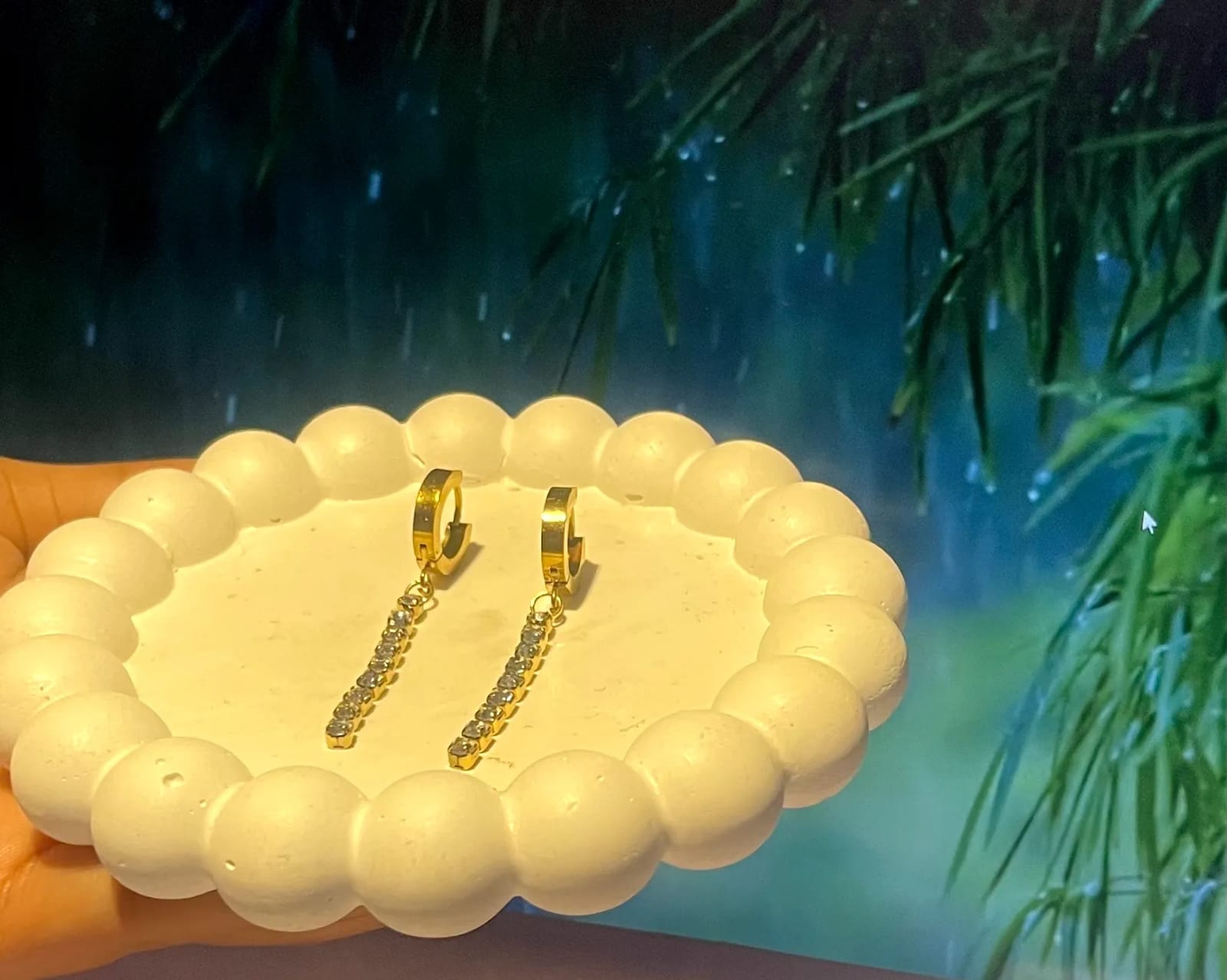 These sophisticated diamond linear earrings feature a sleek, elongated design adorned with sparkling diamond accents, creating a modern and graceful look. The linear silhouette adds effortless elegance and makes them perfect for both day and evening styling. Crafted with 18K gold plating and anti-tarnish coating, these earrings ensure long-lasting shine, durability, and comfortable wear.