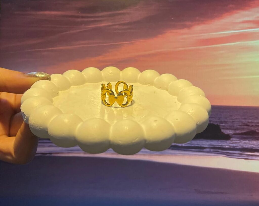 This elegant gold-tone ring is designed to make a subtle yet powerful statement. Featuring a unique dual-loop motif with a smooth, polished finish, it reflects modern minimalism with a touch of artistic charm. The fluid design sits gracefully on the finger, catching light from every angle and adding effortless sophistication to both everyday and occasion looks.