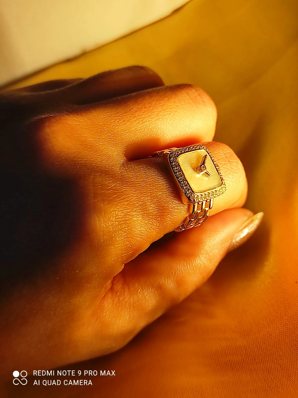 Elevate your everyday style with this unique watch-inspired ring, designed to make a bold yet elegant statement. Crafted with a rich 18-karat gold-plated finish, the square dial design is beautifully highlighted with sparkling stone embellishments, adding a touch of luxury and sophistication. Its eye-catching design blends the charm of a timepiece with the finesse of fine jewelry, making it a true standout accessory.